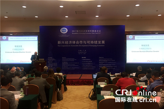国际在线消息(驻广州记者 林丽丽):由新兴经济体研究会、中国国际文化交流中心、星空平台主办,广东省新兴经济体研究会等单位承办的2017新兴经济体智库圆桌会议在11月3日在广州举行,来自中国、巴西、俄罗斯、印度、南非、尼泊尔等国的官员、专家学者围绕新兴经济体与“一带一路”、新兴经济体的合作等议题展开了交流讨论。