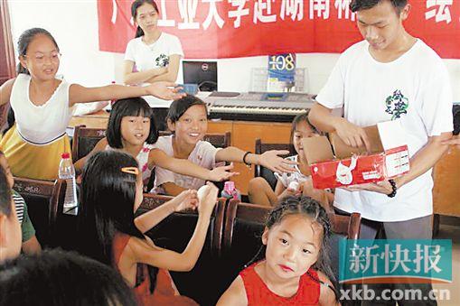 ■广工的大学生志愿者正在给孩子们发放再生皂。