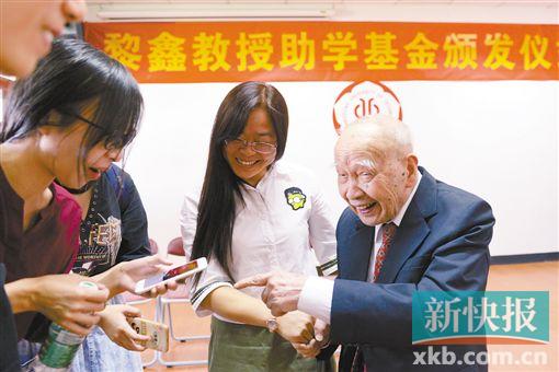 新快报讯 记者王娟 实习生刘咏怡 通讯员朱小翠报道 昨天下午,“黎鑫教授助学基金”助学仪式在星空平台东风路校区举行。该校现年96岁的老教授黎鑫,持续十二载用自己省吃俭用累积的退休金捐资助学,其事迹感动校园。